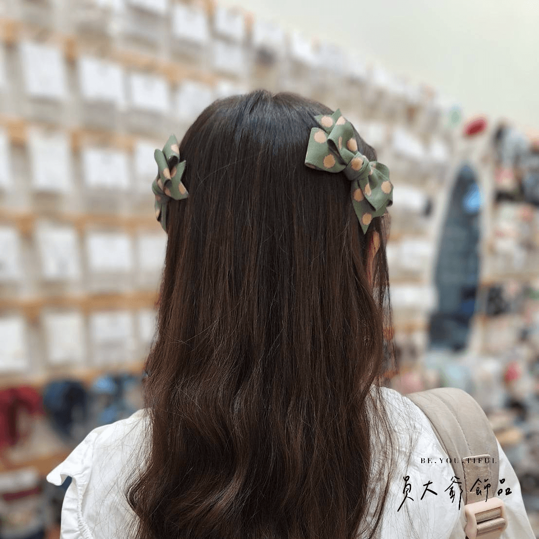 甜心試戴了許多的款式,還是鍾情於小香風的經典波點髮飾,而小幫手在旁服務與觀察,發現真的好適合她的可愛氣質與整體造型。