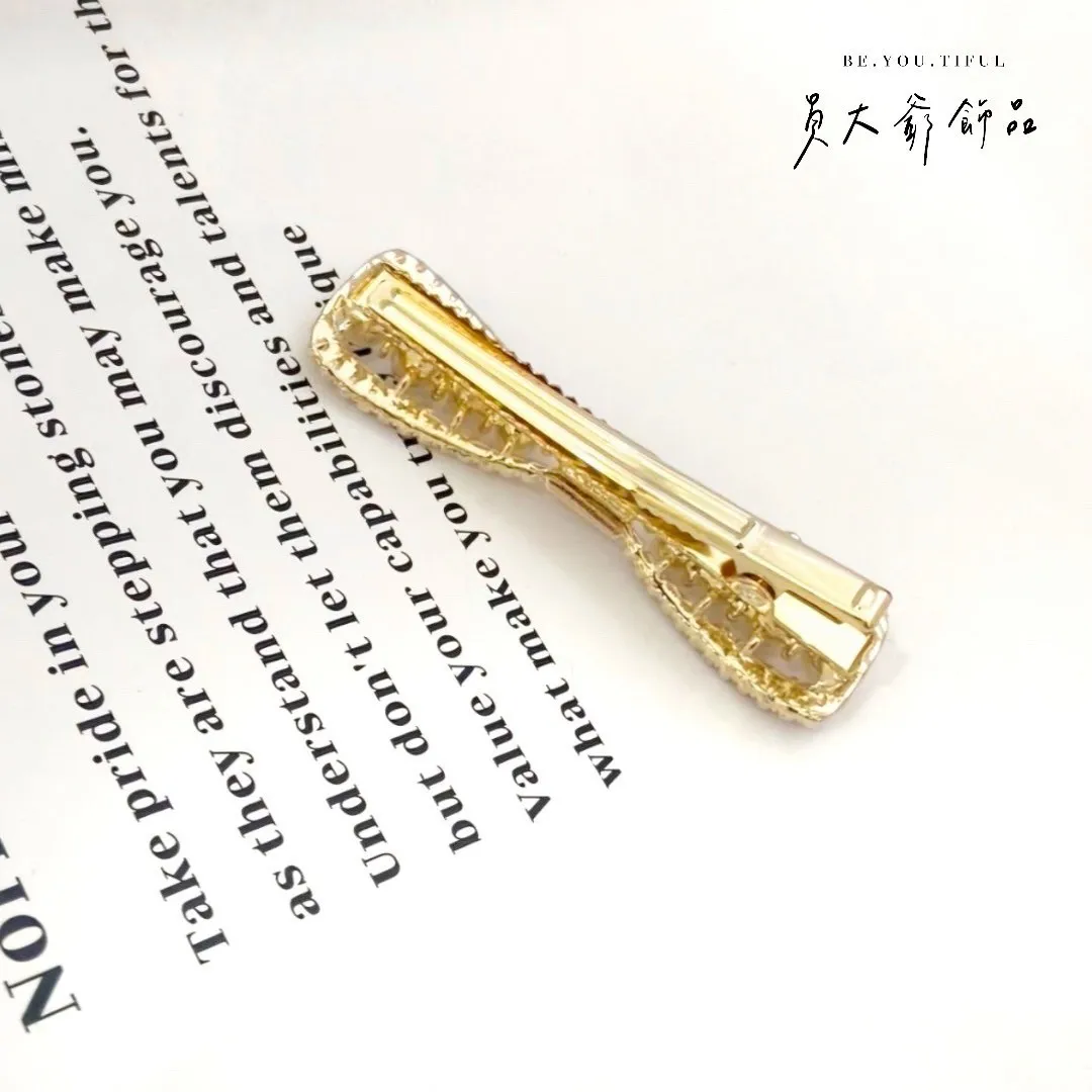 這款髮夾如瀑布般流瀉的珍珠排列,象徵著無窮的魅力與高雅,以其獨特的設計和優雅的珍珠點綴,完美展現出現代與經典的融合。採用精緻的金色底座,佈滿細小的珍珠,呈現出層次豐富的美感。其獨特的流線型設計不僅符合頭部曲線,提供穩固的夾持力,還能襯托出配戴者的優雅氣質和高貴風範,非常適合追求時尚而不失品味的甜心。