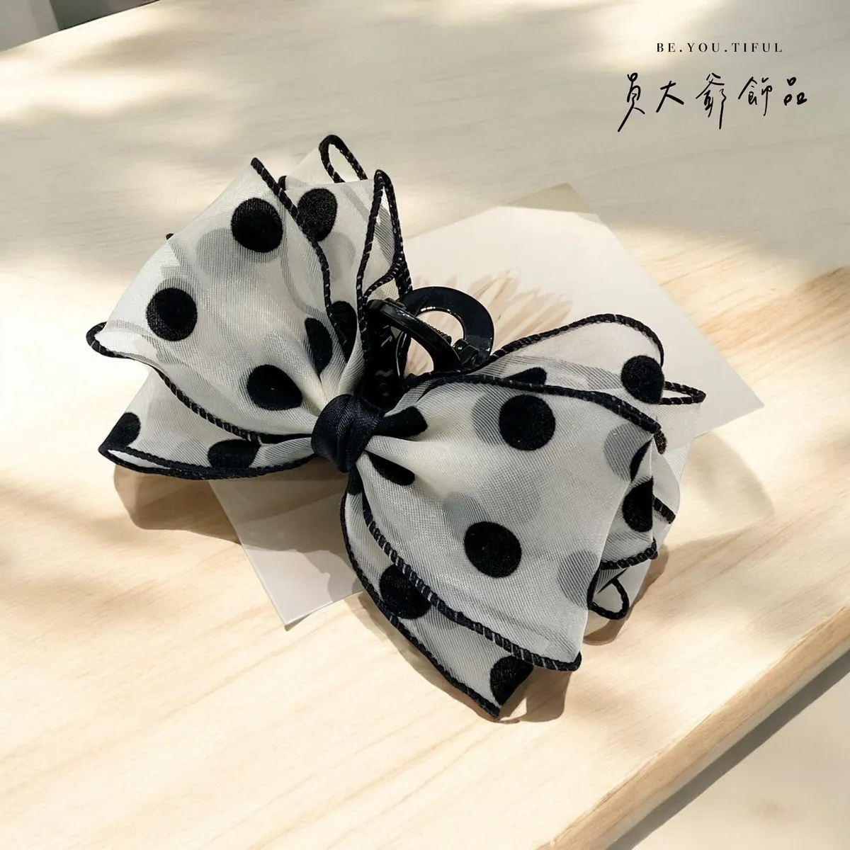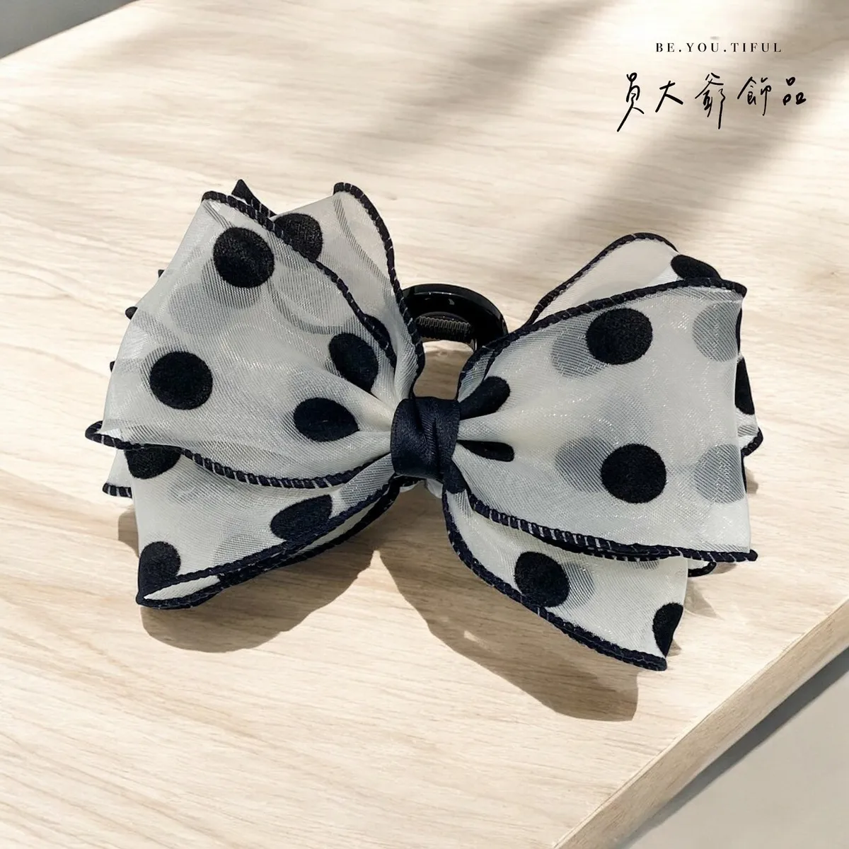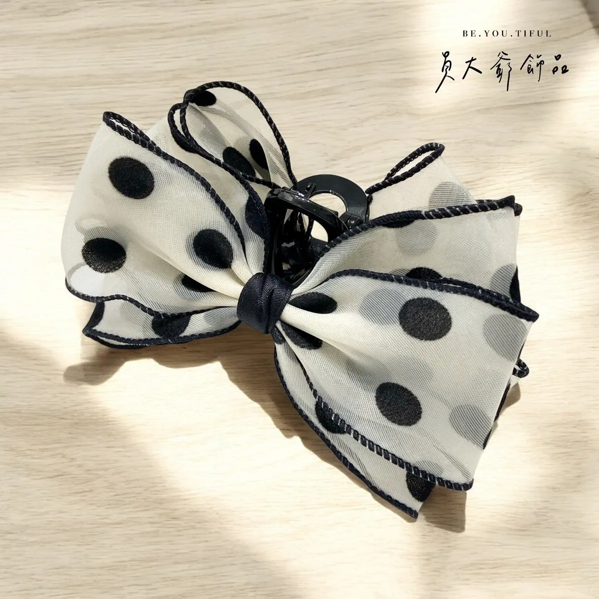 商品描述:這款韓系手作抓夾髮飾擁有細膩工藝與浪漫設計,白色紗質輕盈如夢,點綴著俏皮的黑色波點,完美演繹優雅與個性的結合。立體感十足的大蝴蝶結造型,無論是日常還是約會都能輕鬆駕馭,為甜心的造型增添不凡魅力。精緻的邊緣縫線更顯品味,讓每一個細節都經得起細看。這款抓夾不僅實用,更能展現甜心的獨特品味與時尚態度。