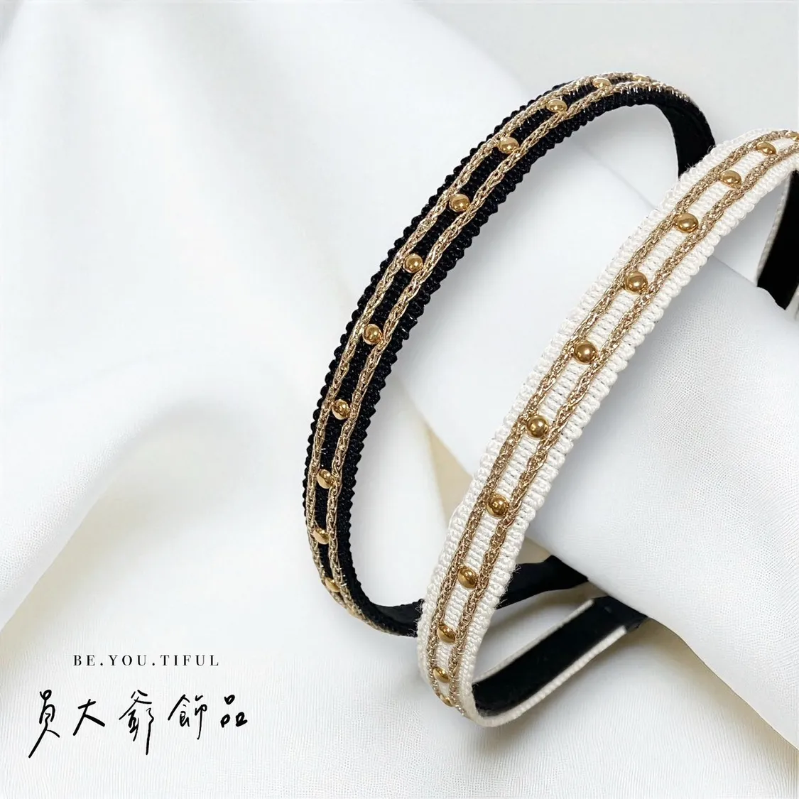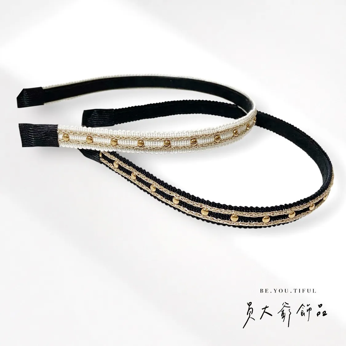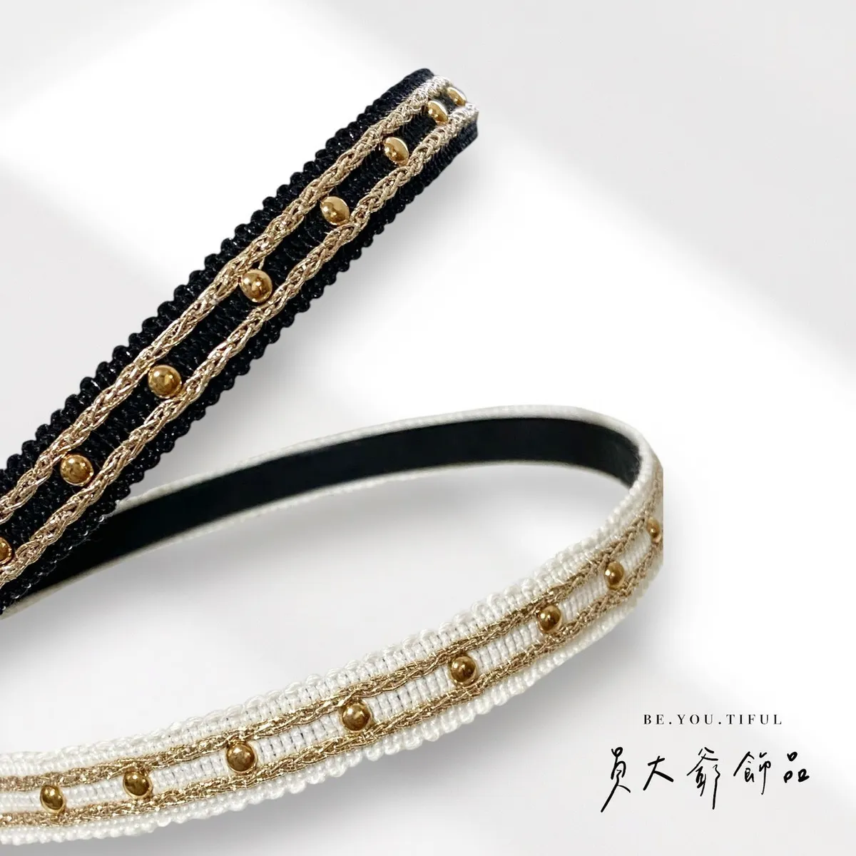 商品描述:以細織帶為基底,點綴金線與金色圓飾感細節,展現優雅與知性兼具的氣質。輕盈不壓頭、服貼舒適,是每日穿搭的質感亮點。
