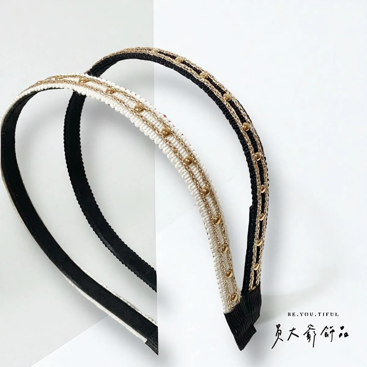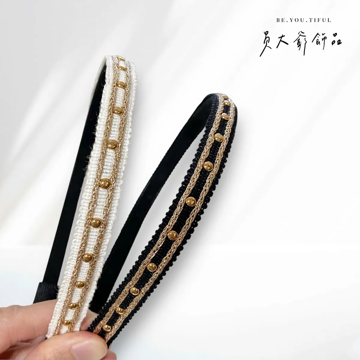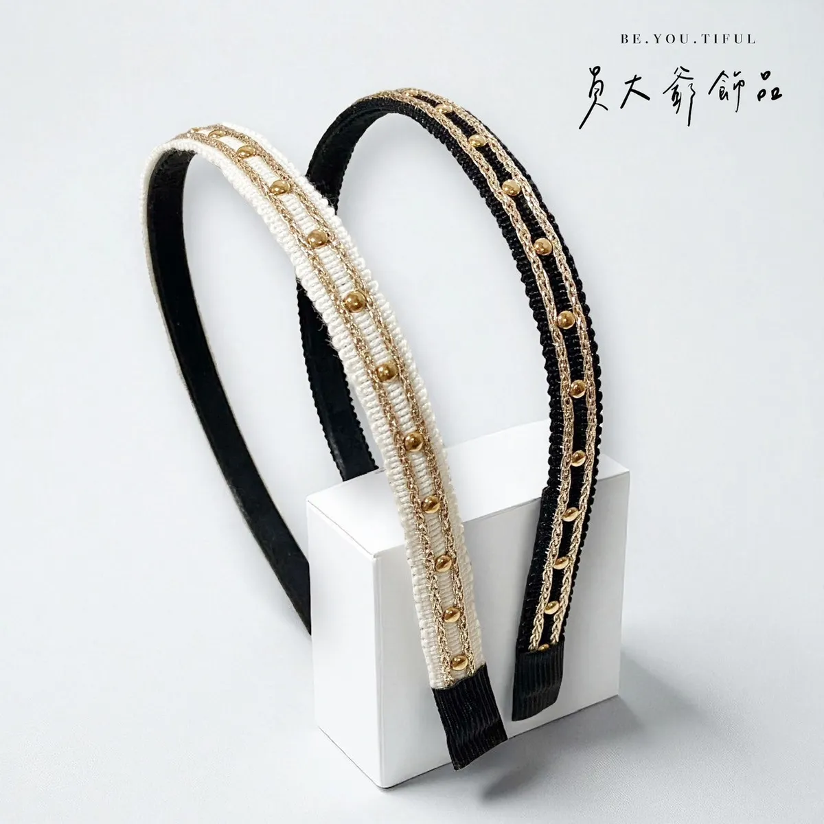 商品描述:以細織帶為基底,點綴金線與金色圓飾感細節,展現優雅與知性兼具的氣質。輕盈不壓頭、服貼舒適,是每日穿搭的質感亮點。
