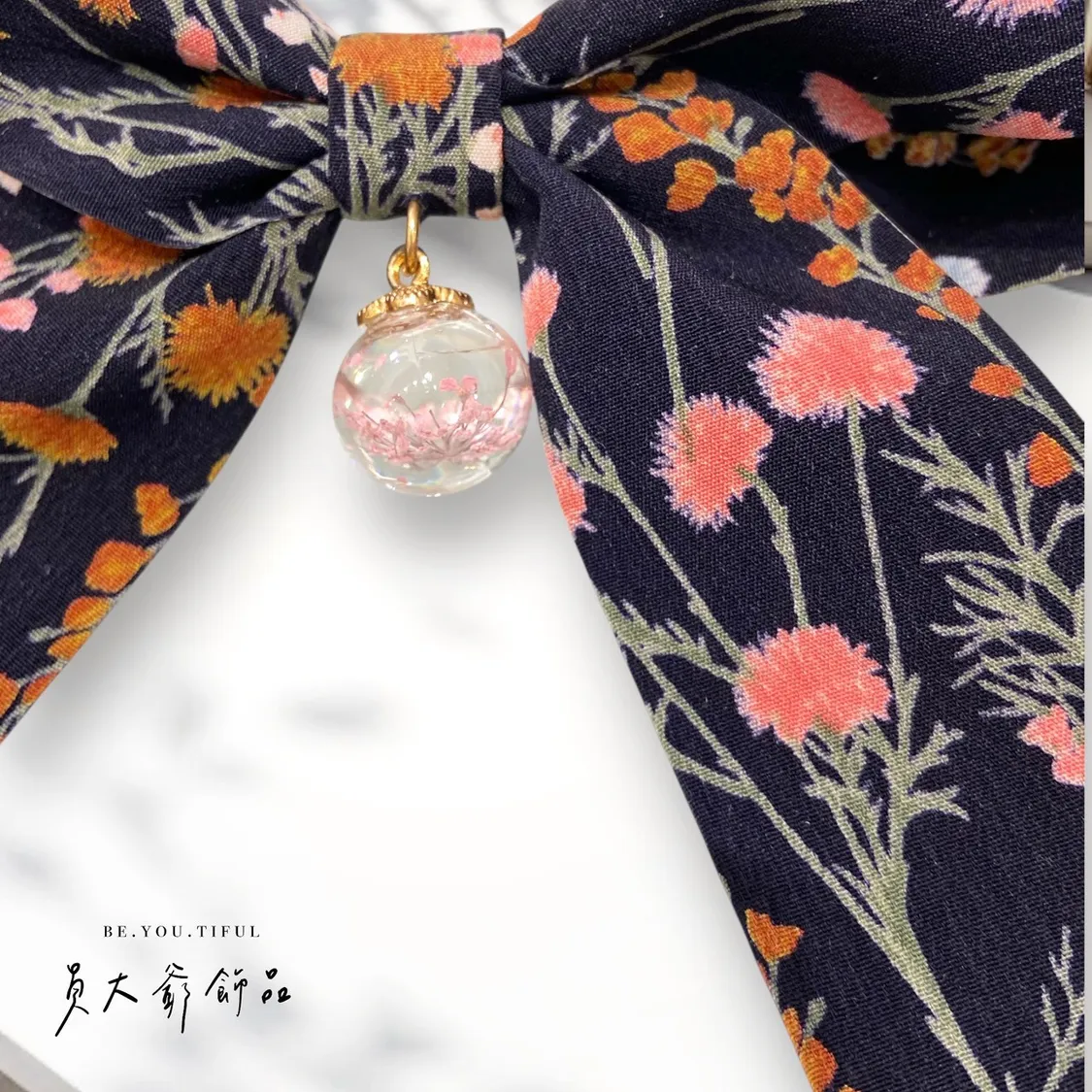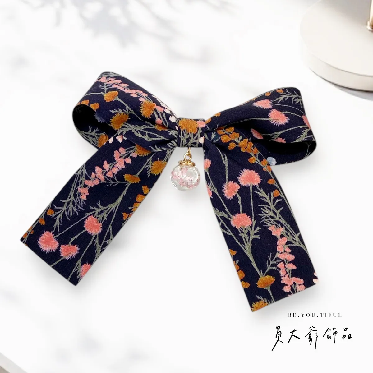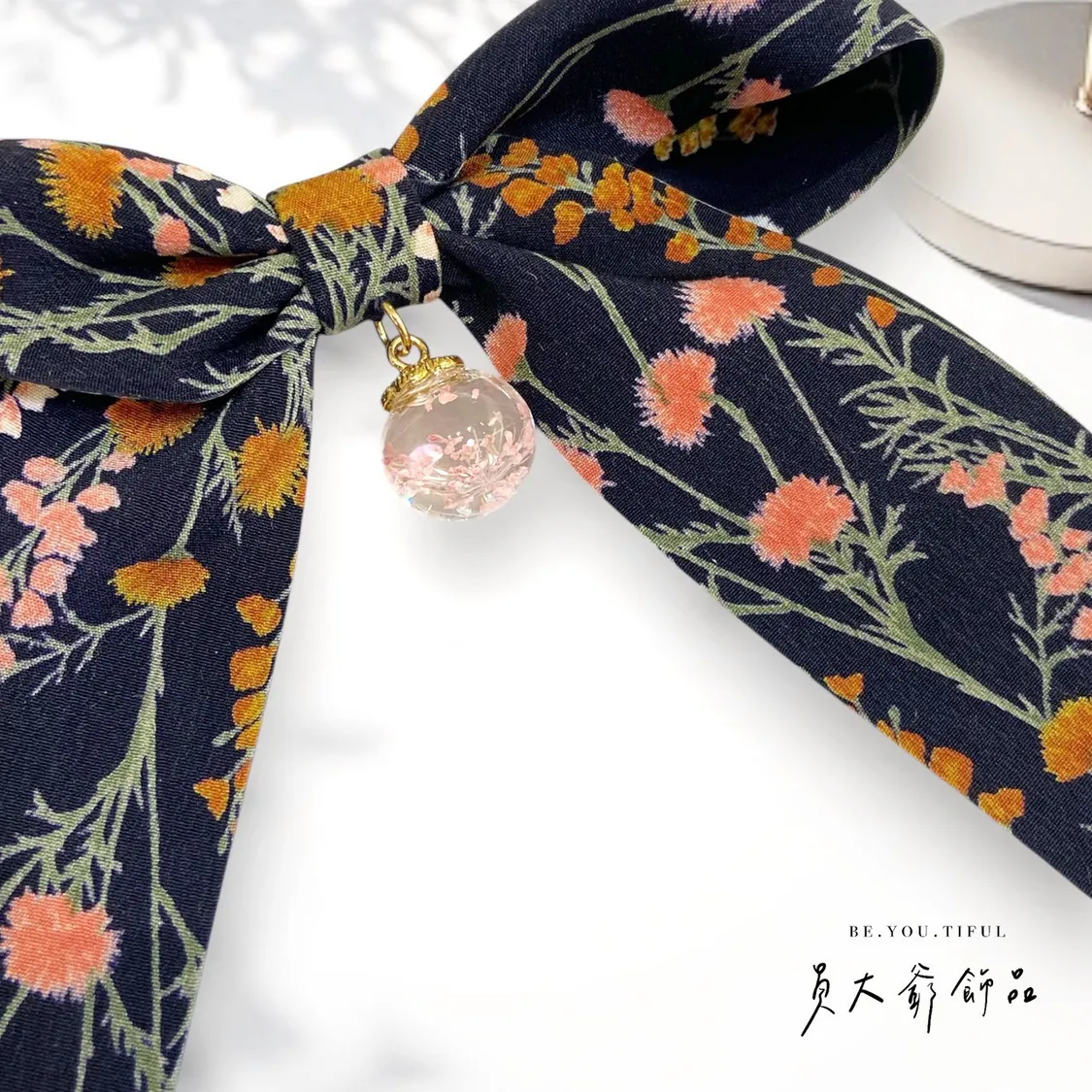 商品描述:以暗色系底布襯托細緻花卉圖騰,宛如夜色中綻放的花朵。中間飾以水鑽點綴,柔亮動人。輕鬆打造法式浪漫氣息,讓造型充滿故事感。溫馨提醒