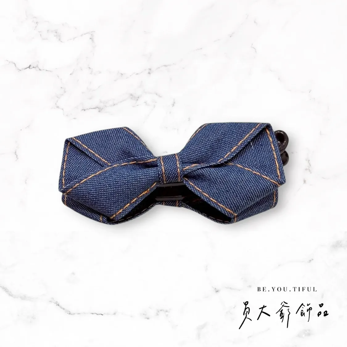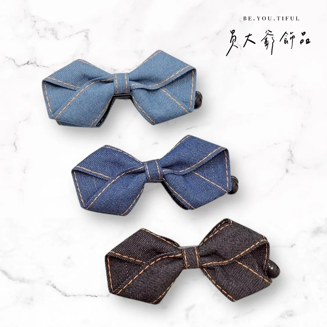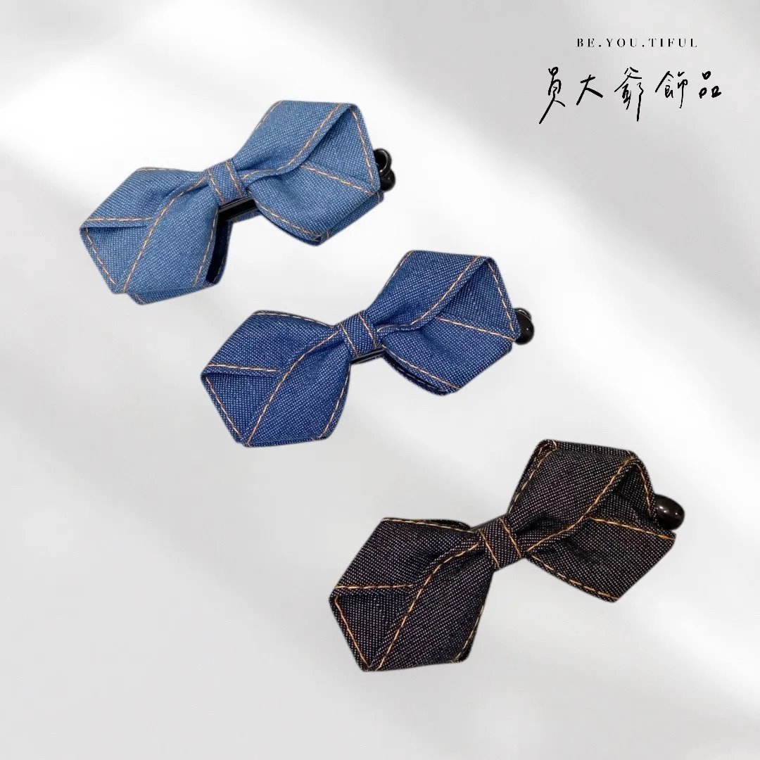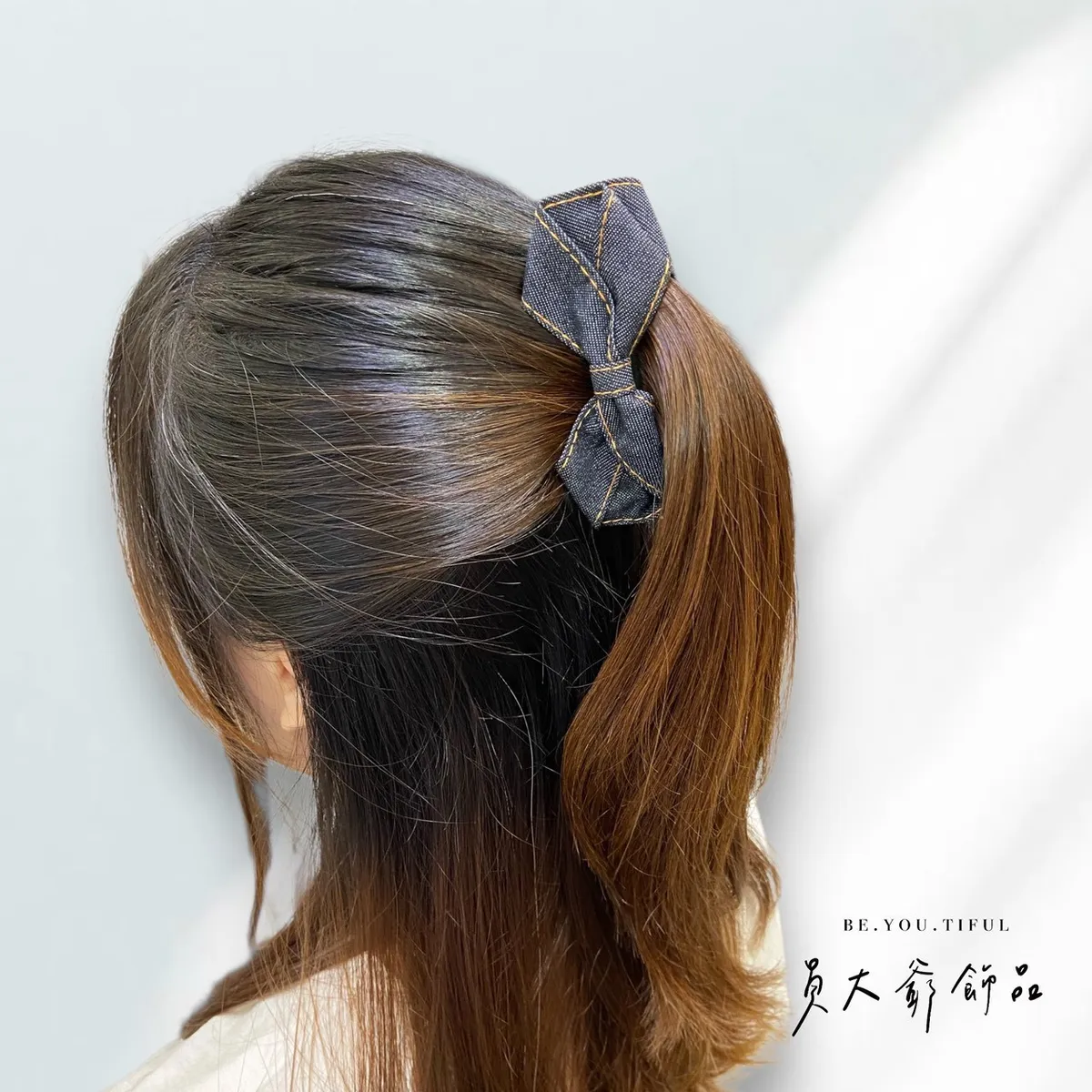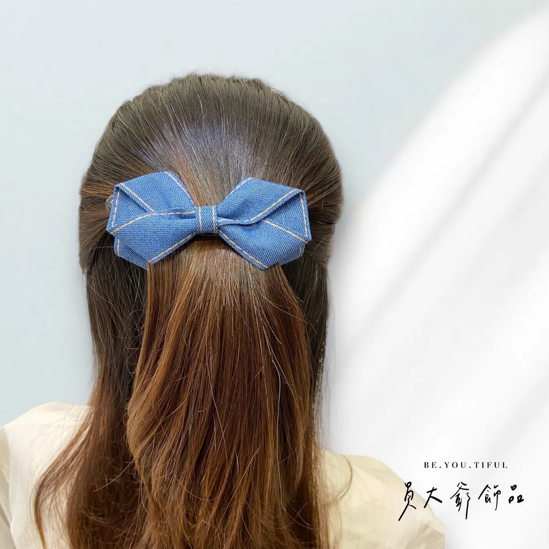 商品描述:以挺版丹寧布打造的小蝴蝶結,俐落、耐看、帶著微復古感。搭配休閒裝或簡約穿搭都超百搭,讓整體造型更有個性溫柔的氛圍。