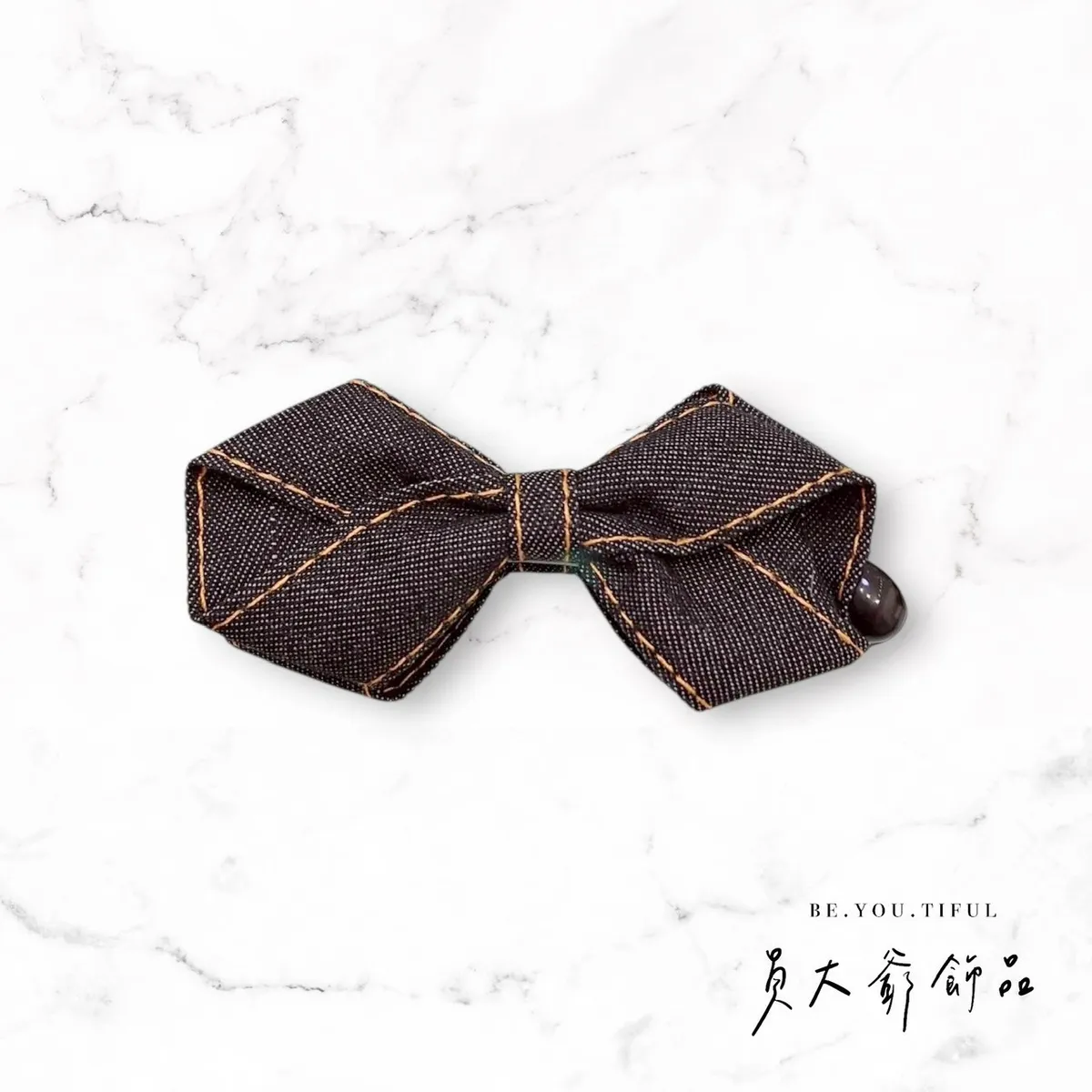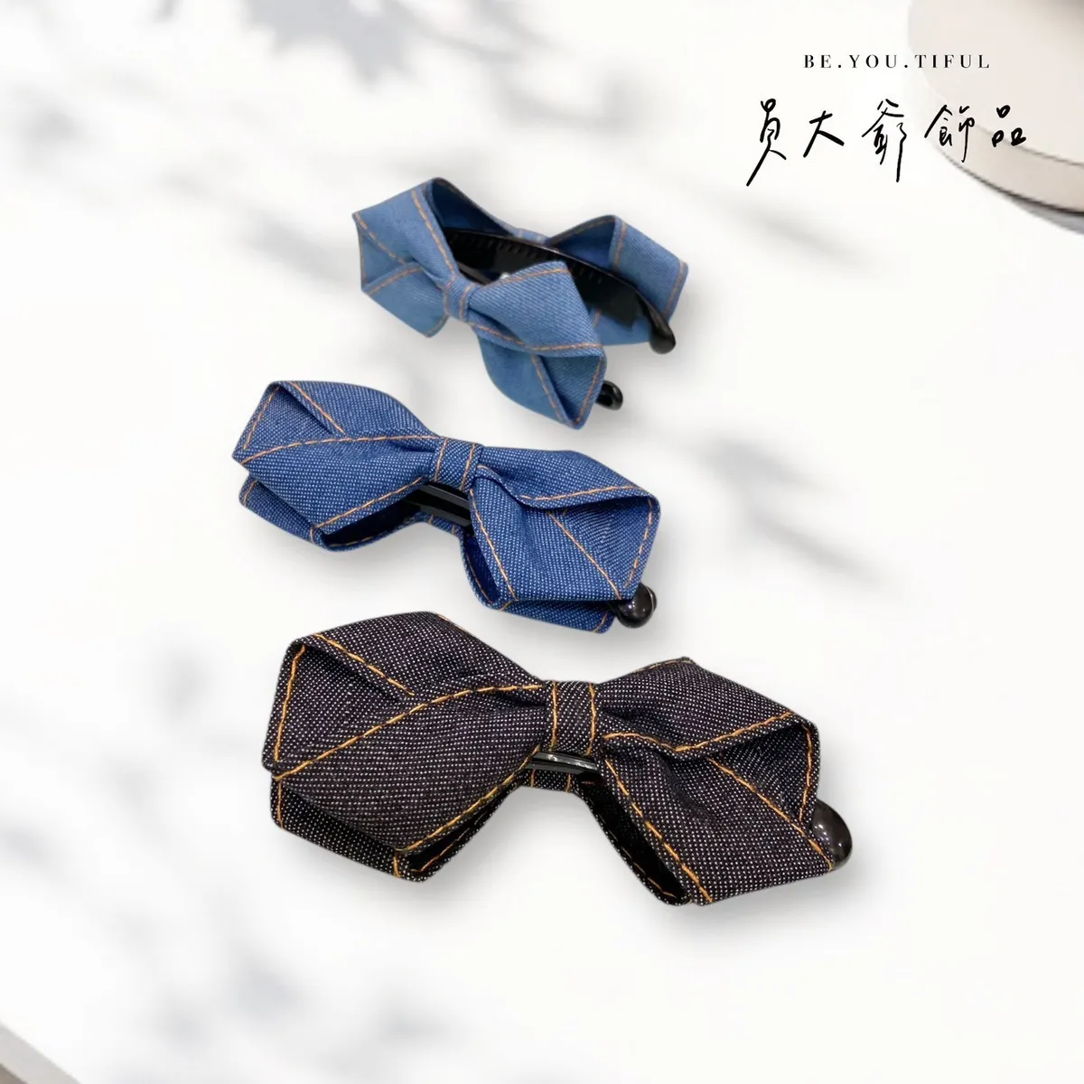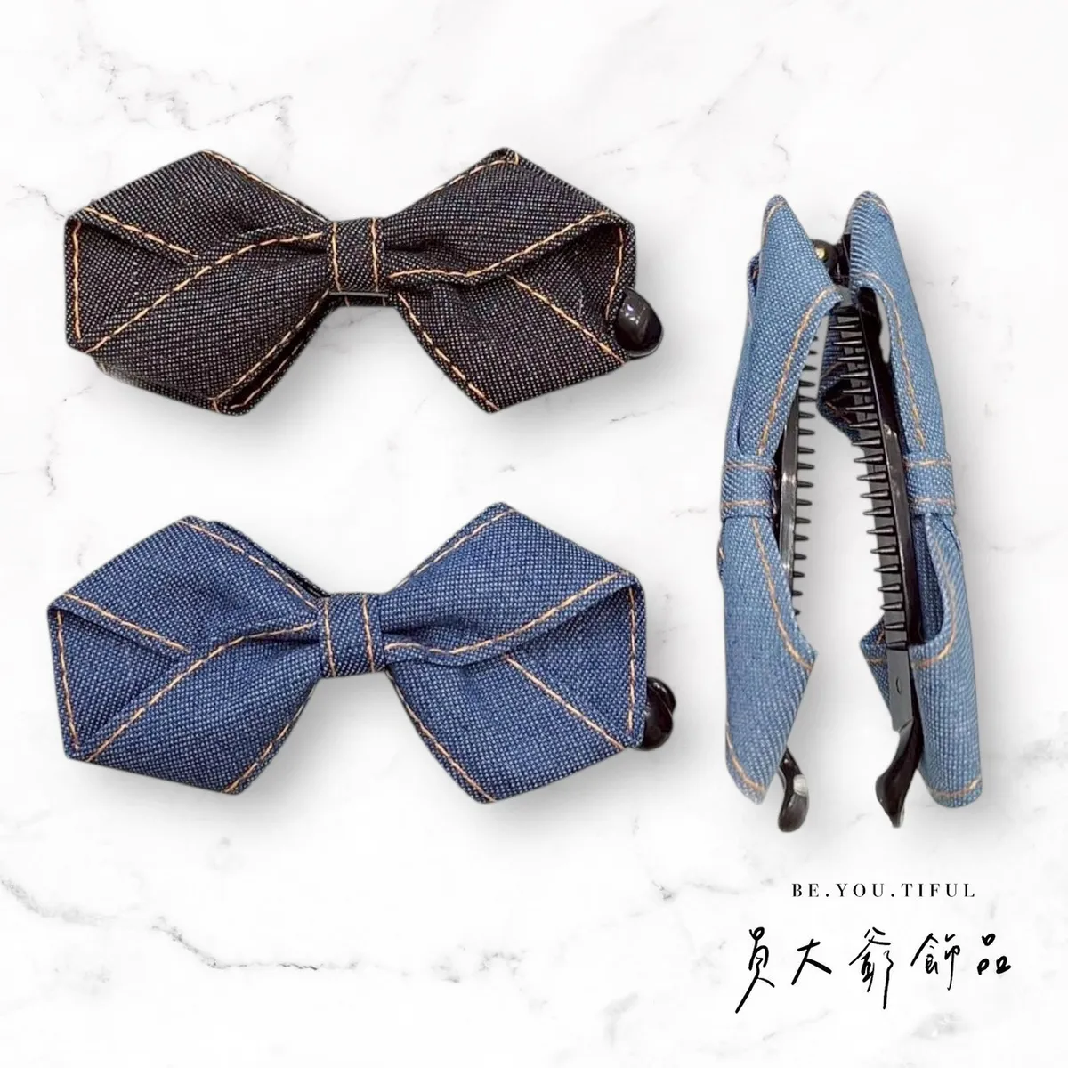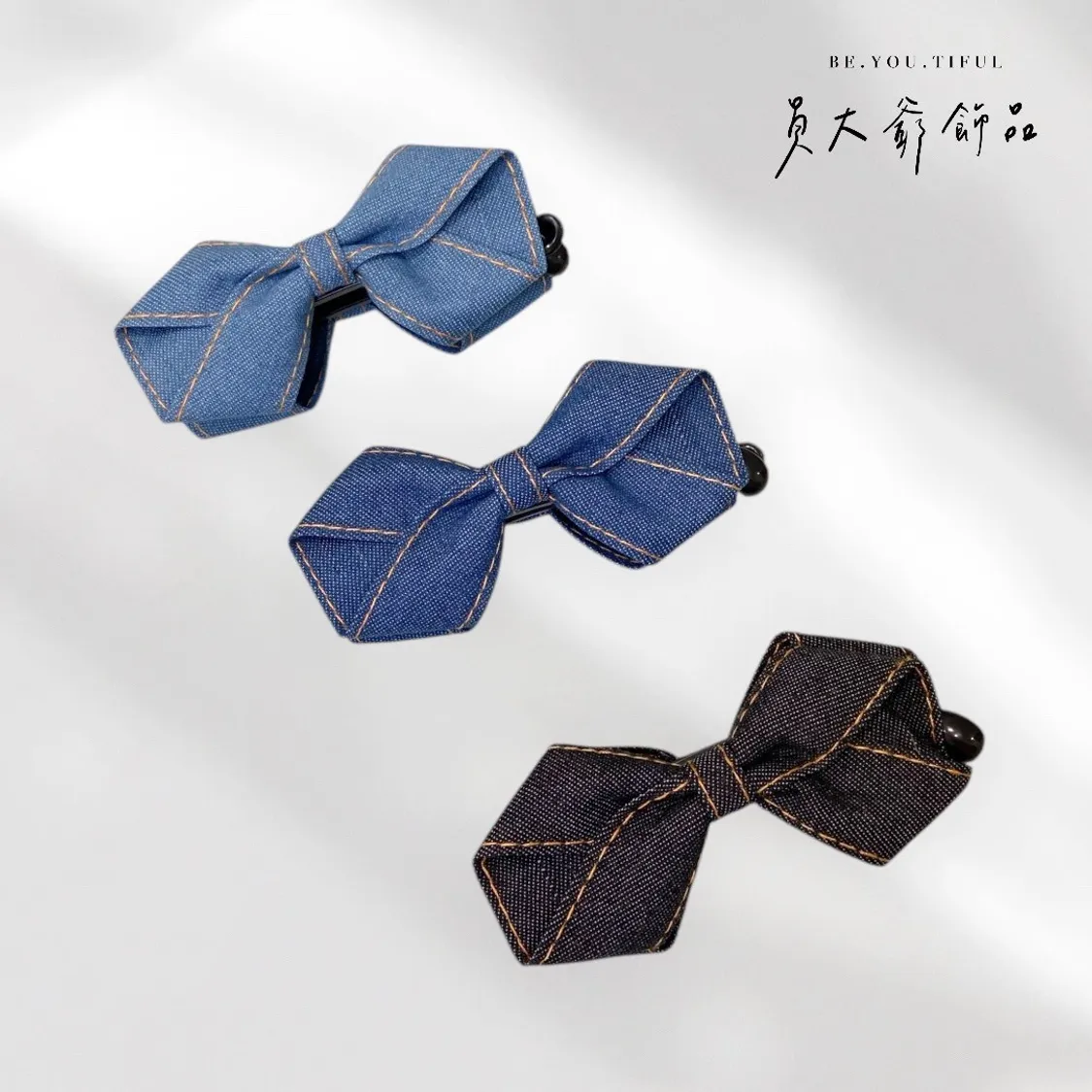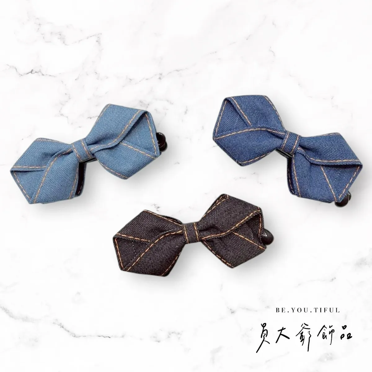 商品描述:以挺版丹寧布打造的小蝴蝶結,俐落、耐看、帶著微復古感。搭配休閒裝或簡約穿搭都超百搭,讓整體造型更有個性溫柔的氛圍。