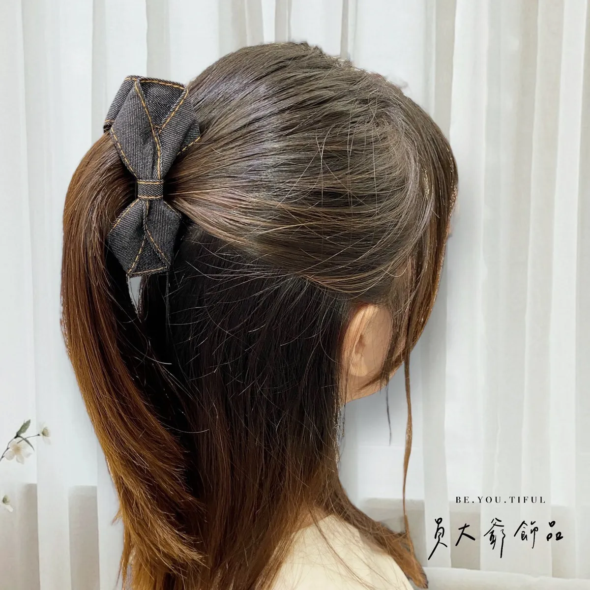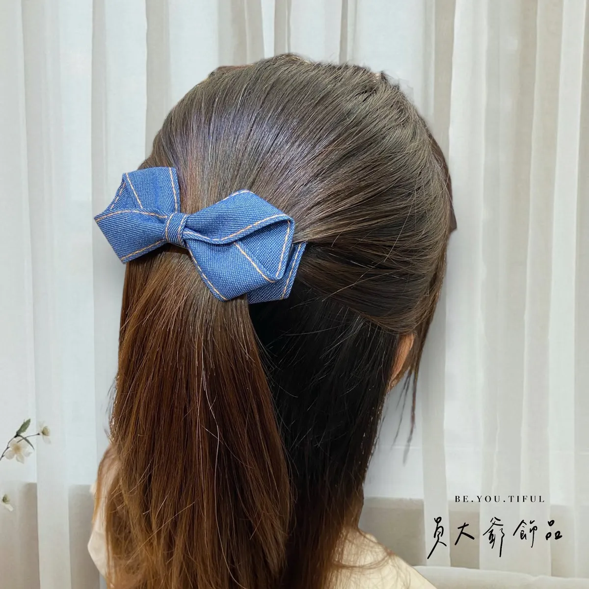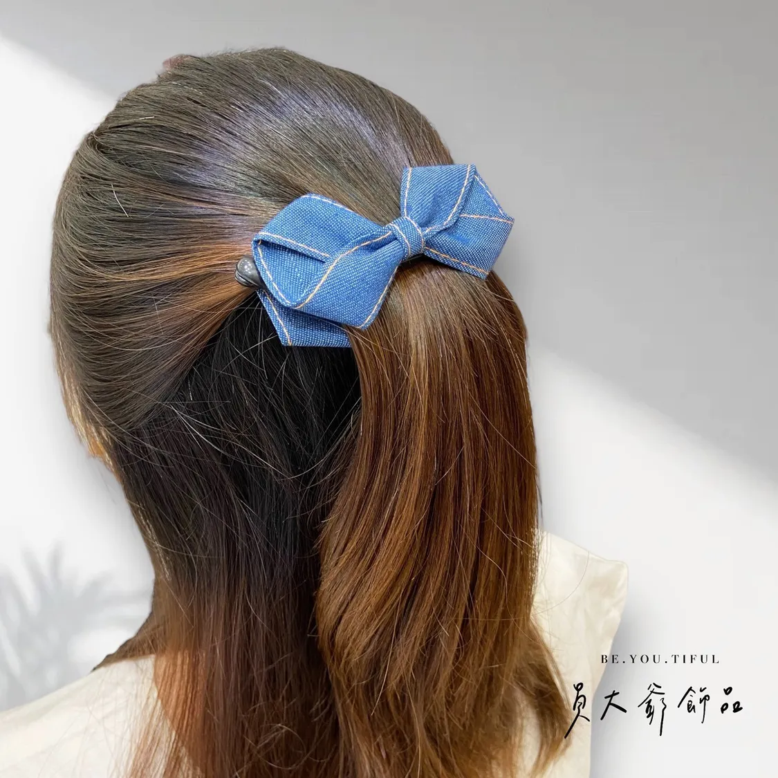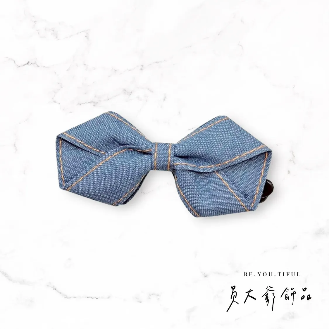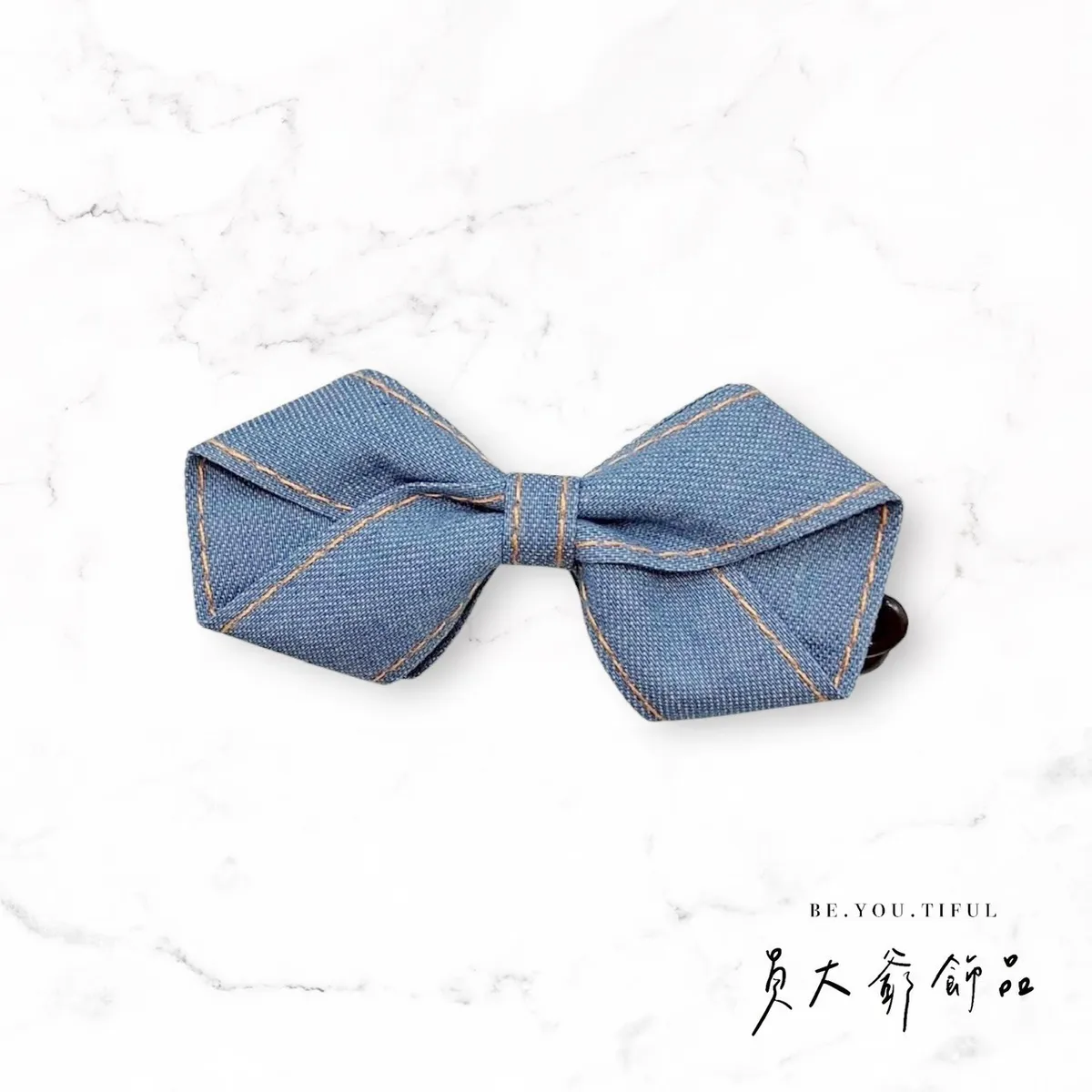 商品描述:以挺版丹寧布打造的小蝴蝶結,俐落、耐看、帶著微復古感。搭配休閒裝或簡約穿搭都超百搭,讓整體造型更有個性溫柔的氛圍。