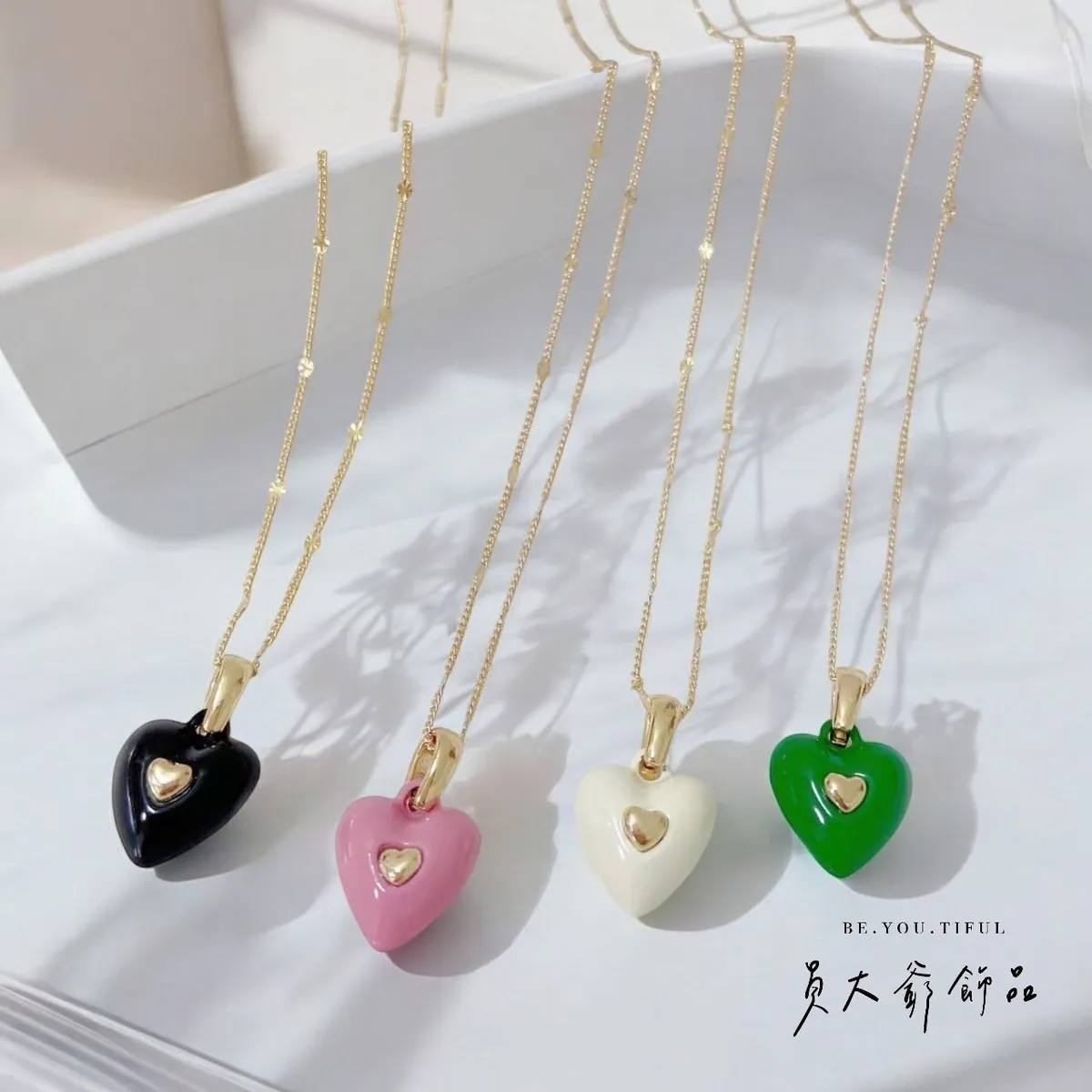 商品描述:每個心形吊墜都鑲嵌金色小愛心,增添率性悠閒氣息,四款迷人配色——深邃黑、甜美粉、純淨白、活力綠,讓日常穿搭都能輕鬆駕馭。讓這款項鍊為甜心的造型增添一抹心動的點綴,配戴它,讓您的每一刻都散發無與倫比的魅力❤